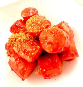 酸味の聞いた甘酸っぱいタレが芋焼酎の風味を最大限に引き立たせてくれます。
